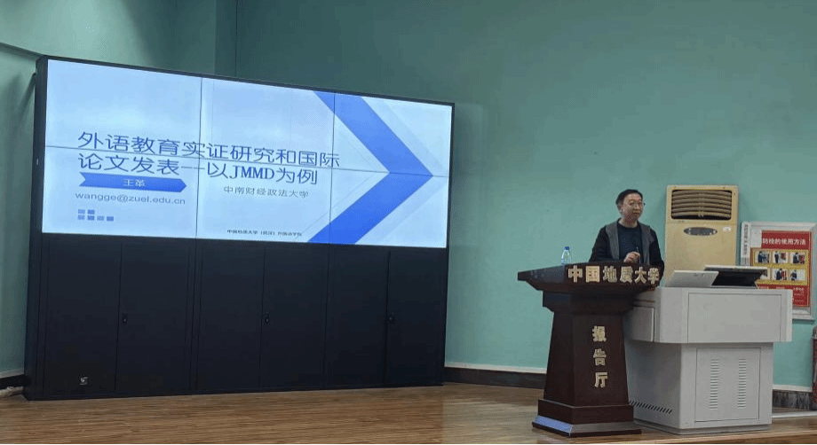 (通訊員:王可可 攝影:于鑫鑫、王子妍)2025年11月13日14:30,中國地質(zhì)大學(xué)(武漢)外國語學(xué)院“南望今聲”外語論壇系列講座第77期在北一樓學(xué)術(shù)報告廳舉行。中南財經(jīng)政法大學(xué)王革教授應(yīng)邀蒞臨中國地質(zhì)大學(xué)(武漢)外國語學(xué)院,作題為“實(shí)證研究和國際論文發(fā)表:以國際核刊JMMD為例”的學(xué)術(shù)講座。外國語學(xué)院張伶俐副院長主持講座,師生共100余人參與學(xué)習(xí)交流。