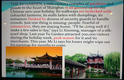 這個(gè)星期的綜合英語課,我拋開了課本,另外選擇了一篇《經(jīng)濟(jì)學(xué)人》中的文章---Coronavirus economics(病毒經(jīng)濟(jì)學(xué))。之所以選擇這篇文章,不僅僅因?yàn)樗膬?nèi)容非常貼合我們當(dāng)下的經(jīng)歷,更重要的是我想通過這篇文章告訴學(xué)生們:疫情雖然對(duì)中國(guó)的經(jīng)濟(jì)產(chǎn)生了極大的負(fù)面影響,但是我們依然要堅(jiān)定信念,期待未來;疫情并不可怕,可怕的是我們看不到這場(chǎng)戰(zhàn)斗中凝聚的希望和力量。講完文章,依然意猶未盡,隨即從網(wǎng)上找到了幾張西南聯(lián)大的照片,并告訴學(xué)生們,西南聯(lián)大是世界教育史上極為光彩的一筆,面對(duì)日寇的侵襲,短缺的物資,艱苦的環(huán)境,前輩們依然孜孜不倦,潛心向?qū)W,成就了大批的學(xué)術(shù)泰斗和兩位諾貝爾獎(jiǎng)獲得者,這種精神在目前的形勢(shì)下更值得我們學(xué)習(xí)和思考。清華大學(xué)前校長(zhǎng)梅貽琦在回答學(xué)生“什么是真實(shí)”的問題時(shí)說到:“你看到什么,聽到什么,做什么,和誰在一起,有一種從心靈深處滿溢出來的不懊悔、也不羞恥的平和與喜悅,這就是真實(shí)。”我把這段話寫在了我的PPT最后一頁,我想告訴學(xué)生們,雖然遠(yuǎn)離塵囂,但老師希望他們依然能夠內(nèi)心篤定,從容平和,不忘初心,砥礪前行。只有真實(shí)地感受到內(nèi)在的平靜,才能更好地思考自己的當(dāng)下和未來,思考應(yīng)該怎樣度過這一生。等到春暖花開,回歸校園的時(shí)候我們?cè)倩厥走@個(gè)令人難忘的寒假,不會(huì)因?yàn)樘摱饶耆A而悔恨,不會(huì)因?yàn)槁德禑o為而羞恥。