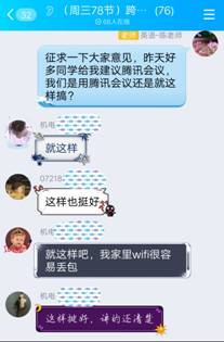 學(xué)生們的認(rèn)可給了我極大的鼓勵(lì),在接下來(lái)的教學(xué)中,我也在不斷地改善自己的課堂:為了彌補(bǔ)錄課缺乏課堂互動(dòng)的缺陷,我把每個(gè)章節(jié)的PPT內(nèi)容分錄成多個(gè)視頻,每個(gè)視頻不超過(guò)30分鐘。對(duì)于需要學(xué)生進(jìn)行課堂討論的話題,我采取將話題以問(wèn)題群的形式在前一個(gè)視頻末尾呈現(xiàn),對(duì)參考答案在后續(xù)視頻的開(kāi)頭進(jìn)行解說(shuō)的辦法,并通過(guò)QQ群分享圖片、組織討論,還通過(guò)提前錄制視頻,就具有共性的作業(yè)問(wèn)題進(jìn)行集中講解。課堂氛圍就這樣活了起來(lái)!為了記錄學(xué)生的出勤狀況,又方便我進(jìn)行逐次統(tǒng)計(jì),我嘗試?yán)?/span>QQ群的“投票”功能進(jìn)行點(diǎn)名,發(fā)現(xiàn)這是一個(gè)不必借助其它軟件而且快捷有效的點(diǎn)名方式。通過(guò)不斷改進(jìn),我的網(wǎng)絡(luò)教學(xué)也逐漸走上了正軌,受到了學(xué)生們和學(xué)院聽(tīng)課領(lǐng)導(dǎo)的好評(píng)。
