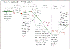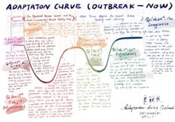 《跨文化交際》是大三年級專業(yè)選修課,課程第四講主題是“跨文化適應(yīng)”。跨文化適應(yīng)是交際者面對陌生文化環(huán)境帶來的壓力,不斷做出自我調(diào)整,逐步適應(yīng)新生活方式的過程。研究者們通過構(gòu)建曲線模型來展現(xiàn)適應(yīng)過程的特征。鑒于疫情期間學(xué)生的跨文化交際實(shí)踐受限,我將這一模型與學(xué)生面對疫情所做出的自我調(diào)整結(jié)合,啟發(fā)同學(xué)們以圖文(英文)共現(xiàn)的形式手繪自己疫情期間的適應(yīng)模型,讓他們通過多彩的圖案和流動的文字分享自己積極調(diào)整、主動適應(yīng)的心路歷程,并與跨文化適應(yīng)模型進(jìn)行比對,加深對跨文化適應(yīng)理論的理解。