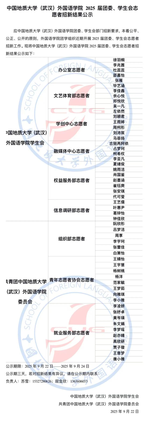 應中國地質(zhì)大學(武漢)外國語學院團委、學生會部門招新要求,本著公平、公正、公開的原則,外國語學院團學組織近期開展2025屆團委、學生會志愿者招新工作,現(xiàn)將中國地質(zhì)大學(武漢)外國語學院 2025 屆團委、學生會志愿者招新結(jié)果公示如下: