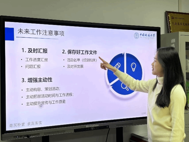 最后由兼職輔導(dǎo)員鄭佳宜進(jìn)行總結(jié)發(fā)言。她首先點(diǎn)評了負(fù)責(zé)人們的述職表現(xiàn),并針對匯報(bào)展示提出了許多中肯的改進(jìn)建議。對于研會工作,鄭佳宜表示,在工作中應(yīng)前瞻規(guī)劃、三思后行,注重會務(wù)細(xì)節(jié)與工作質(zhì)量。她再次強(qiáng)調(diào),團(tuán)隊(duì)協(xié)作對于研究生會發(fā)展的重要性,要在各項(xiàng)任務(wù)中發(fā)揮協(xié)作效能。