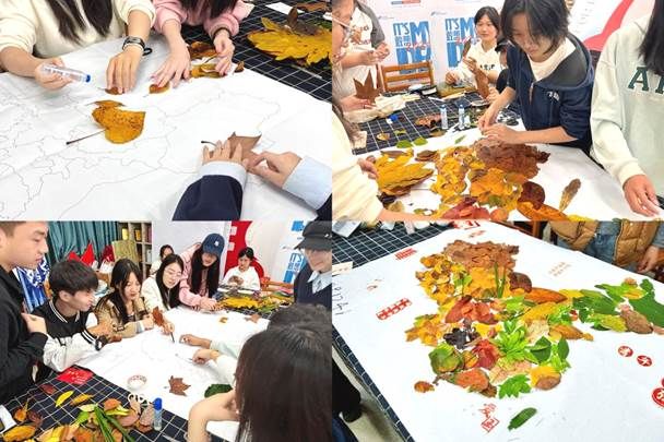 在“逐秋游園”環(huán)節(jié),同學(xué)們以宿舍為單位在校園內(nèi)收集秋葉,返回教室后共同協(xié)作,用片片秋葉拼貼出完整的中國(guó)地圖。這一創(chuàng)意環(huán)節(jié),既展現(xiàn)了自然之美,更寓意著青年一代以青春裝點(diǎn)山河、共護(hù)錦繡中華的共同信念。