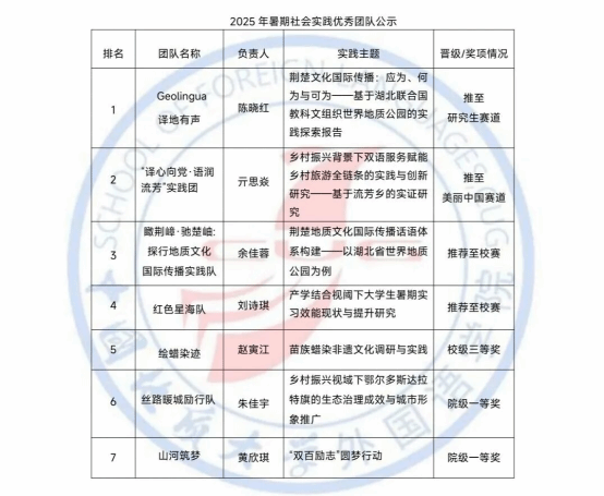 秉持公平、公正、公開的原則,外國語學(xué)院 2025 暑期社會(huì)實(shí)踐優(yōu)秀團(tuán)隊(duì)評(píng)審工作已完成,現(xiàn)將結(jié)果公示如下: