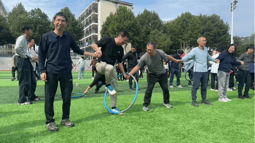 協(xié)力向前沖比賽中,老師們步伐統(tǒng)一,彼此支撐,將信任化為前進(jìn)的動(dòng)力。