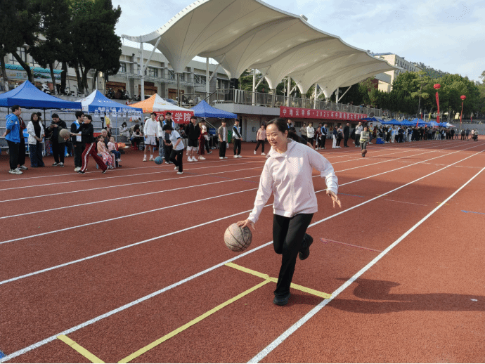 學(xué)院賴小春老師疾步如飛、控球穩(wěn)健,勇奪60米拍球跑全校第5名。