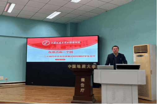 在隨后的“語(yǔ)翼”團(tuán)校第一課中,余尚蔚面向全體學(xué)員宣講二十屆四中全會(huì)精神,他從全會(huì)提到的“人民”“全面”“現(xiàn)代化”“高質(zhì)量”“發(fā)展”等8個(gè)高頻詞出發(fā)引導(dǎo)學(xué)員思考高頻詞背后蘊(yùn)含的深意,從五個(gè)切入點(diǎn)把握全會(huì)的精神。他指出,全會(huì)的目標(biāo)任務(wù)是對(duì)新時(shí)代青年成長(zhǎng)成才的召喚,是需要包括全體團(tuán)學(xué)骨干在內(nèi)的大學(xué)生厚植家國(guó)情懷、練就過(guò)硬本領(lǐng)、扎實(shí)奉獻(xiàn)實(shí)踐才會(huì)實(shí)現(xiàn)的。他強(qiáng)調(diào),團(tuán)校是培養(yǎng)團(tuán)員骨干的重要陣地,是共青團(tuán)為黨育人、為國(guó)育才的關(guān)鍵一環(huán)。圍繞這一培養(yǎng)目標(biāo),學(xué)生骨干要以堅(jiān)定理想信念為根、以服務(wù)奉獻(xiàn)為本、以自我鍛煉為途,做到“有魂”、“有心”、“有心”、“有根”、“有為”。要強(qiáng)化思想政治覺(jué)悟,做堅(jiān)定信念的引領(lǐng)者;提升溝通協(xié)作能力,做組織發(fā)展的推動(dòng)者;明晰自身定位、堅(jiān)守責(zé)任擔(dān)當(dāng),激發(fā)內(nèi)生動(dòng)力、追求卓越實(shí)效。他希望,學(xué)員們要珍惜學(xué)習(xí)機(jī)會(huì),在服務(wù)同學(xué)的實(shí)踐中不斷拓展自身成長(zhǎng)的“圓”,以實(shí)際行動(dòng)繪就新時(shí)代外國(guó)語(yǔ)學(xué)院團(tuán)學(xué)骨干畫像,努力成長(zhǎng)為有品德、有品質(zhì)、有品位、具備全球勝任力的時(shí)代新人。授課最后,他對(duì)全體學(xué)生黨員和骨干提出要以更高的標(biāo)準(zhǔn)、更嚴(yán)的要求、更實(shí)的行動(dòng)提升自己,努力在遵規(guī)守紀(jì)方面作表率;要提高鑒別能力、增強(qiáng)防范意識(shí)、提高斗爭(zhēng)本領(lǐng)、加強(qiáng)警示提醒,努力在防詐騙和守安全方面做榜樣示范和教育服務(wù)。