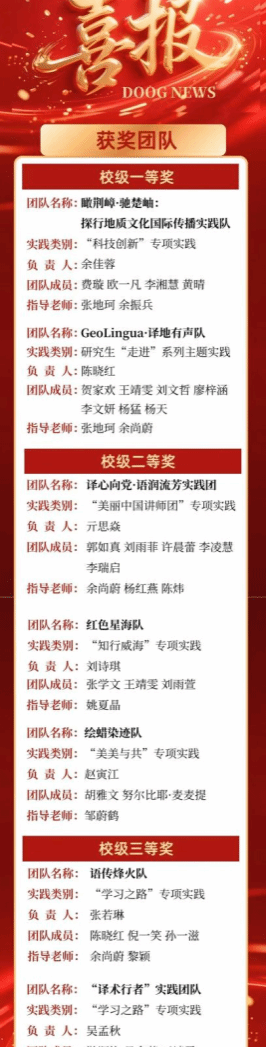 熱烈祝賀外國語學院在2025年暑期社會實踐校級答辯中斬獲佳績!在本次暑期社會實踐中,各團隊指導老師的深入指導下,圍繞"、研究生"走進"系列主題實踐,“科技創(chuàng)新”、“美麗中國講師團”、“知行威海”、“美美與共”、“學習之路”等專項實踐,深入一線開展實踐探索,以扎實的行動、詳實的成果展現(xiàn)了外國語學院學子的責任擔當與實踐能力。經(jīng)校級評審,我院多支團隊脫穎而出,共斬獲校級一等獎2項、校級二等獎3項、校級三等獎2項,這份成績的取得離不開指導教師的悉心指導,更凝聚了每一位團隊成員的辛勤付出。現(xiàn)將獲獎團隊詳情公示如下,再次向所有獲獎團隊致以熱烈祝賀!