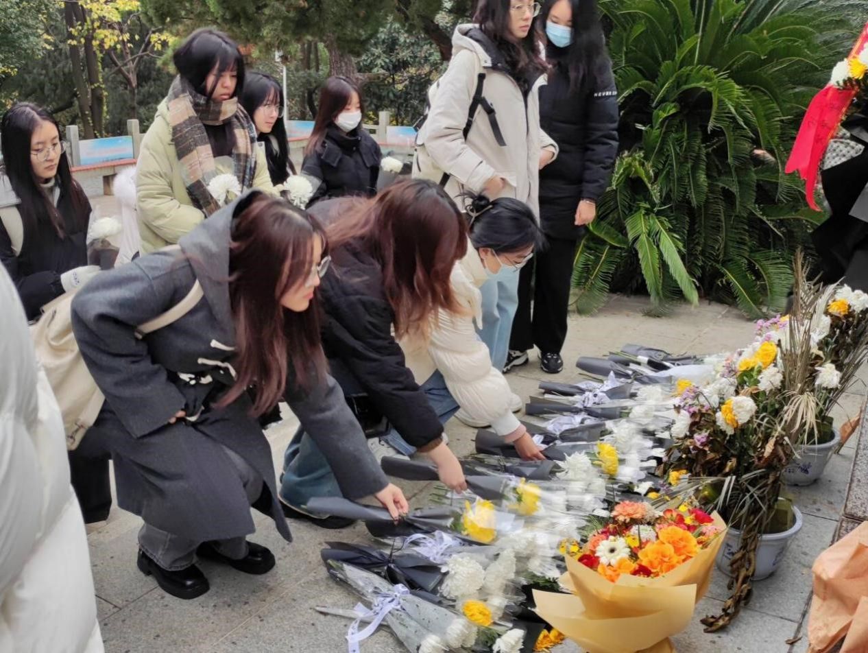 (圖為同學(xué)們上前獻(xiàn)花)