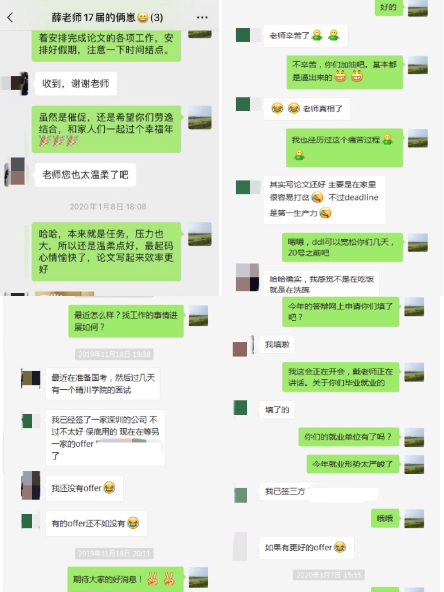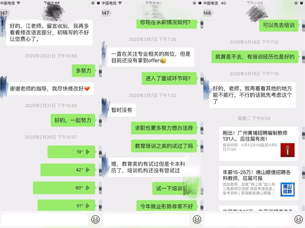 除學(xué)校和學(xué)院組織的網(wǎng)絡(luò)雙選會、空中宣講會以及在線面試之外,導(dǎo)師們也都通過多種途徑主動跟進(jìn)畢業(yè)生就業(yè)意向、就業(yè)動態(tài),不遺余力地尋找各類就業(yè)信息與途徑,在自己有限的能力范圍內(nèi)盡最大可能幫助學(xué)生解決就業(yè)難題。王偉老師和汪衛(wèi)紅老師常在研究生群里發(fā)布專業(yè)相關(guān)招聘和培訓(xùn)信息。李孝奎老師通過電話與自己的研究生進(jìn)行溝通,與研究生召開定期例會,就文獻(xiàn)閱讀,科研探索和實(shí)習(xí)實(shí)訓(xùn)等話題進(jìn)行交流和指導(dǎo)。李老師今年的畢業(yè)研究生方同學(xué)面臨著初步入職協(xié)議保底、簽訂意向協(xié)議、備戰(zhàn)公務(wù)員考試等幾種選擇,目前疫情造成不少工作停滯,李老師在學(xué)生迷茫時常給予鼓勵和建議。