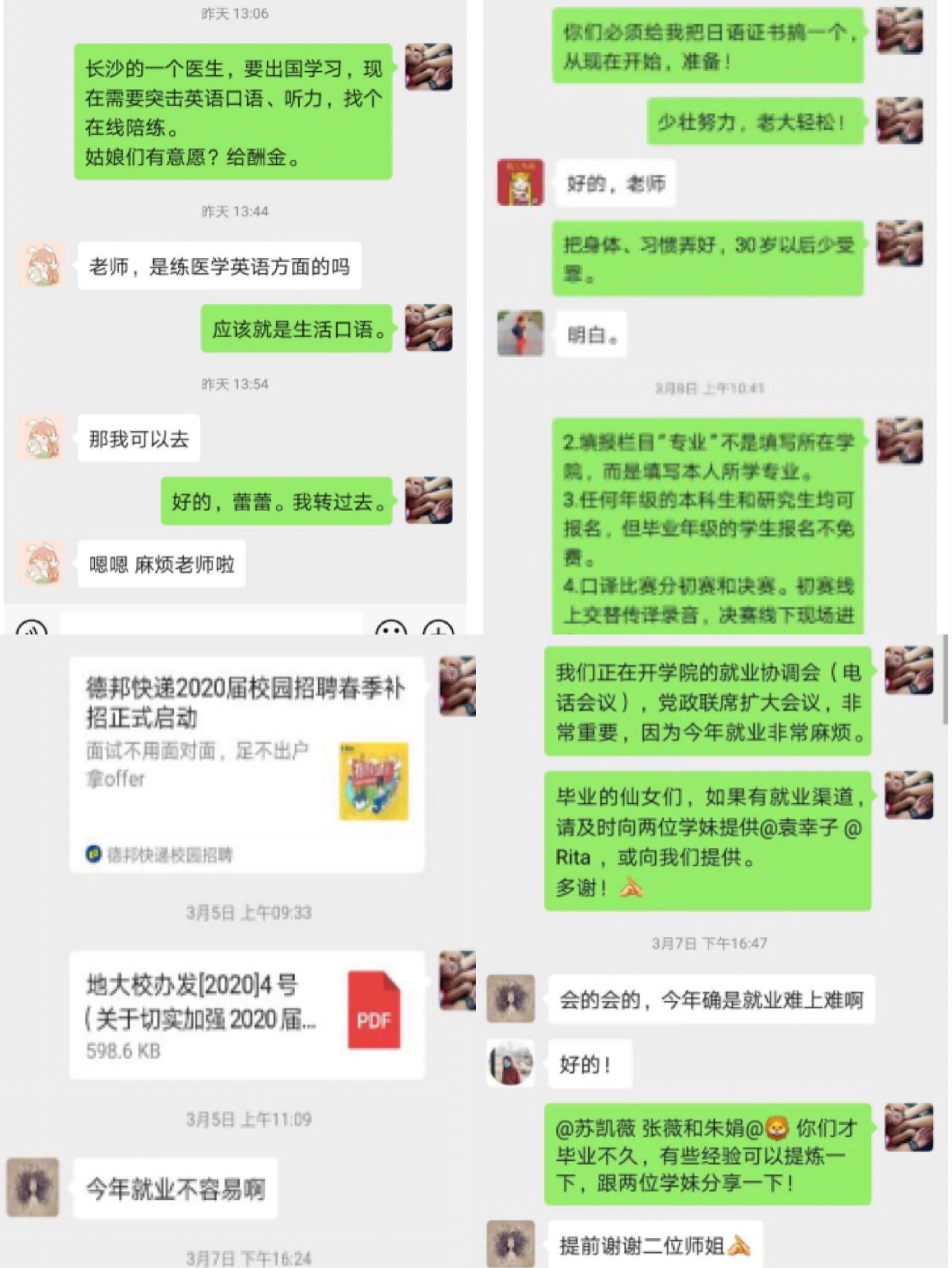(通訊員 金虹)三月,疫情發(fā)展持續(xù)向好,但畢業(yè)生就業(yè)升學(xué)的形勢依然嚴(yán)峻。面對疫情防控和畢業(yè)生就業(yè)的雙重壓力,外國語學(xué)院及時建立與疫情防控相適應(yīng)的畢業(yè)生就業(yè)工作機(jī)制,號召全體教職員工調(diào)動一切資源和力量,深入了解和幫助學(xué)生,堅決打贏就業(yè)攻堅戰(zhàn)。外院研究生導(dǎo)師們積極響應(yīng)學(xué)校、學(xué)院號召,對畢業(yè)研究生在求職就業(yè)和心理疏導(dǎo)方面給予了無微不至的關(guān)懷與幫助。在求職就業(yè)方面,他們及時了解學(xué)生動態(tài),不遺余力幫助學(xué)生尋找各類招聘信息和資源,加強(qiáng)求職觀念、技能和面試的線上指導(dǎo);在生活方面,他們在確保學(xué)生論文順利完成的同時,密切關(guān)注學(xué)生的身體和心理健康。在學(xué)校和學(xué)院之外,他們是畢業(yè)研究生身邊最可靠的堅強(qiáng)后盾。