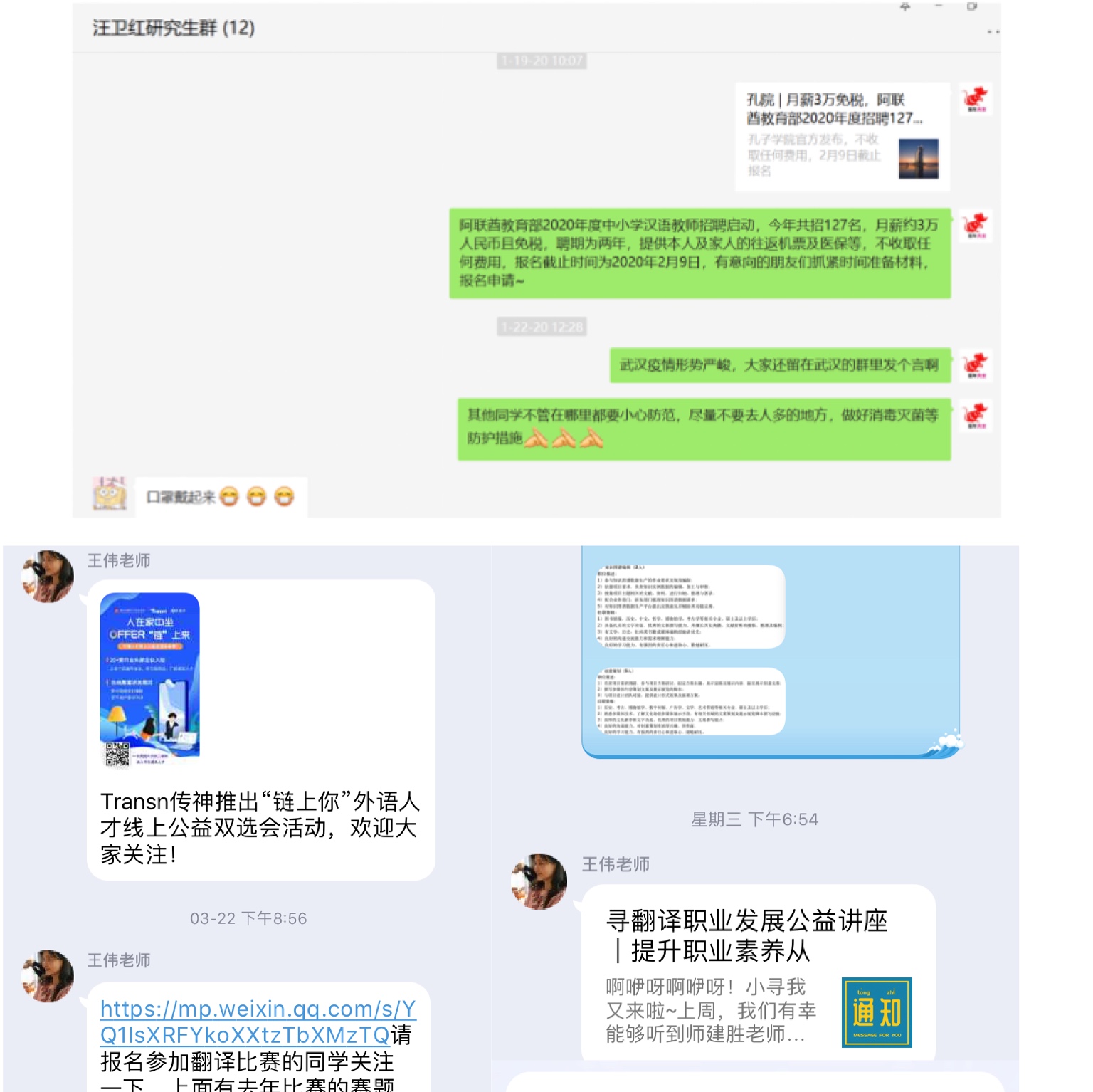 王偉老師和汪衛(wèi)紅老師在研究生群中發(fā)布招聘和培訓(xùn)信息
